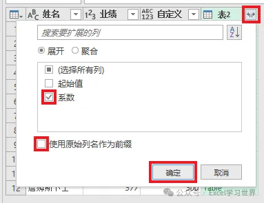 11. 点开“表2”旁边的扩展钮 –> 仅勾选“系数”–> 取消勾选“使用原始列名作为前缀”–> 点击“确定”