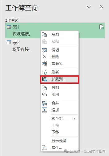 19. 在右侧的“工作簿查询”区域选中“表1”–> 右键单击 –> 在弹出的菜单中选择“加载到”