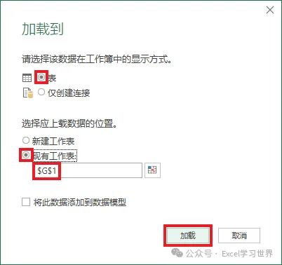 20. 在弹出的对话框中选择“表”–> 选择“现有工作表”及所需上载至的位置 –> 点击“加载”