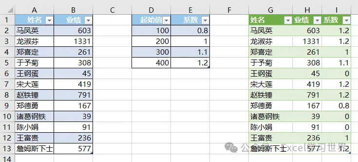 将下图 1 中左侧数据表的业绩按以下规则与右侧匹配,计算出奖金系数。