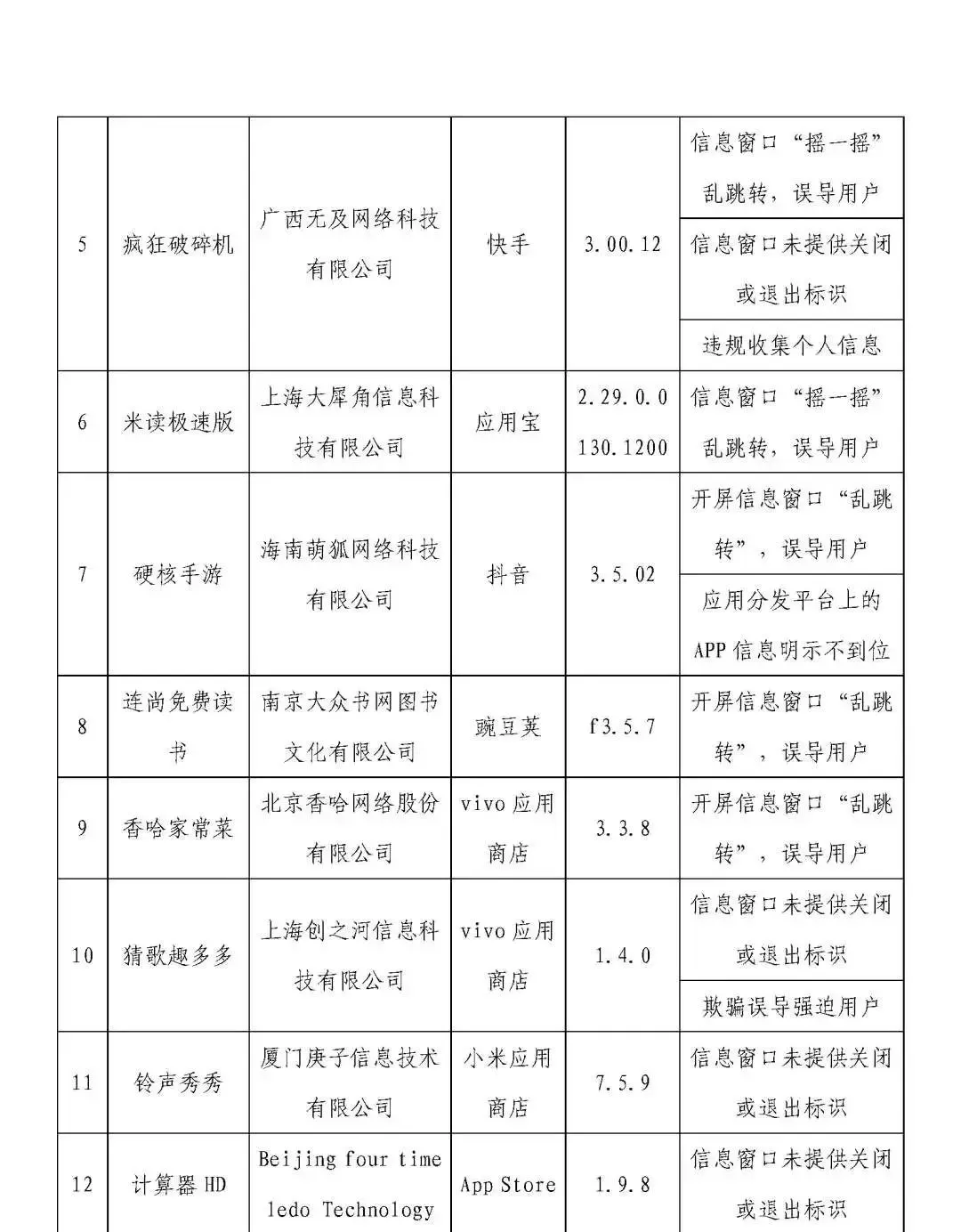 工业和信息化部高度重视用户权益保护工作,依据《中华人民共和国个人信息保护法》《中华人民共和国网络安全法》《电信条例》《电信和互联网用户个人信息保护规定》等法律法规,持续整治APP侵害用户权益的违规行为。近期,我部组织第三方检测机构对用户反映突出的“摇一摇”乱跳转、信息窗口“关不掉”以及违规收集使用个人信息等问题进行检查,共发现62款APP及SDK存在侵害用户权益行为(详见附件),现予以通报。