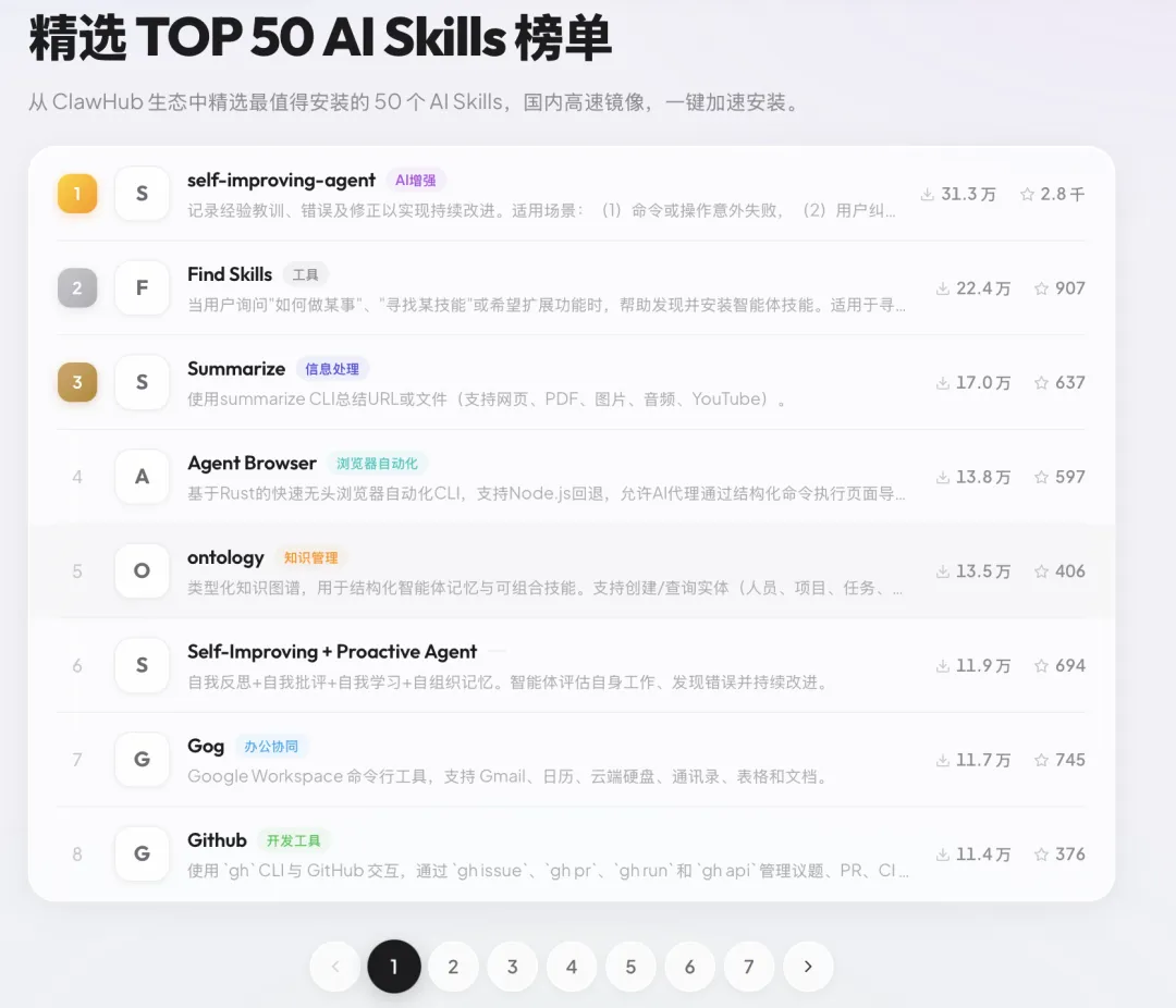 总之这个榜单的含金量还是很不错的,而且对国内的用户也比较友好,我看了下排名前 50 的 skill ,觉得还是挺有意思的,在这里挑几个出来讲一下,作为新手,给还没用起来的朋友推荐几个,我个人觉得很管用的 skill