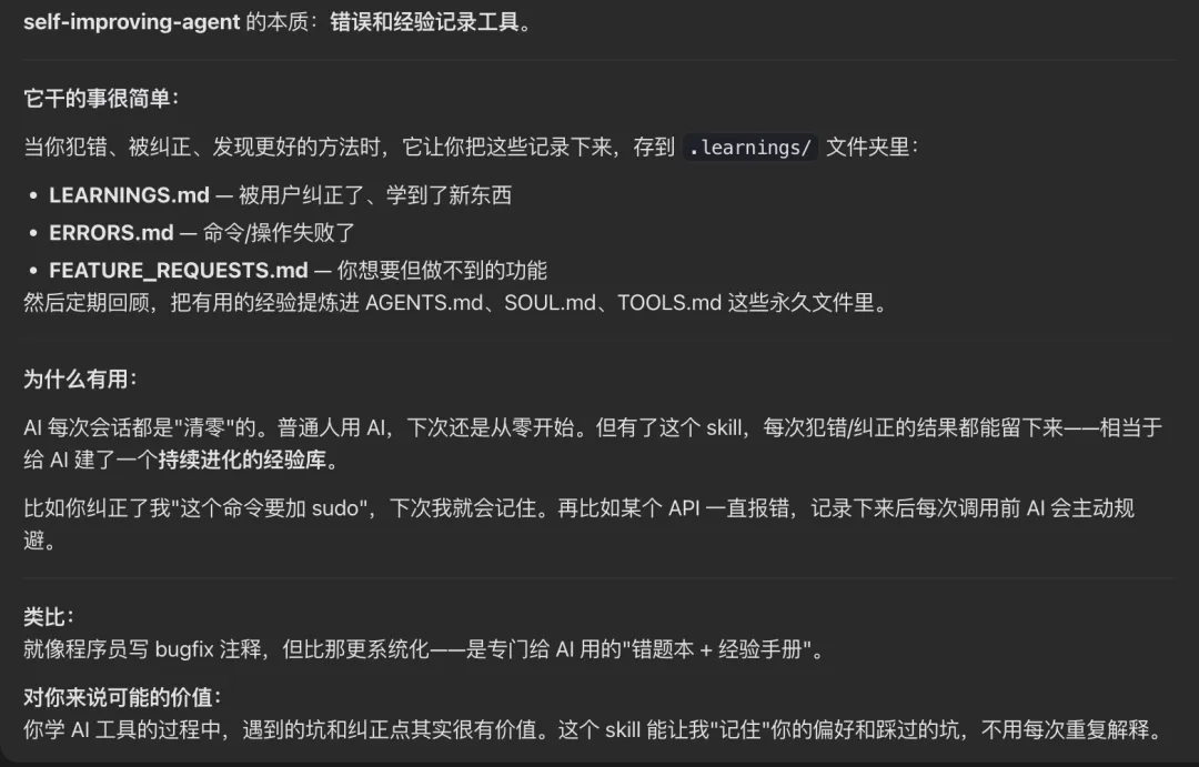 简单解释,它是一个记录经验和错误的工具,方便 OpenClaw 每次的犯错都能记录下来。