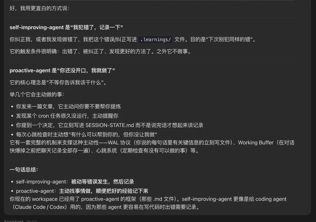 跟这个 skill 配合的还有第 5 个,叫 Self-Improving + Proactive Agent ,建议一起下载,向龙虾问了一下,它的用法跟前面的区别是,会主动识别有哪些问题,主动提醒跟进,不需要被动提醒,很适合放到一起下载。