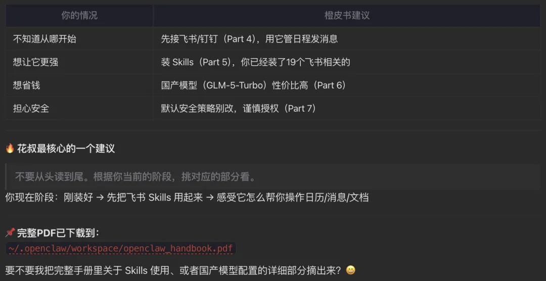 举个最近的例子:正巧昨天飞书开放了 MCP 工具,我关联以后,最近正想学 OpenClaw 的知识点,一句话就可以让龙虾帮我把有用的pdf文件下载到本地,而不是我自己打开飞书,搜索文件,下载,仅仅一句话就足以安装。