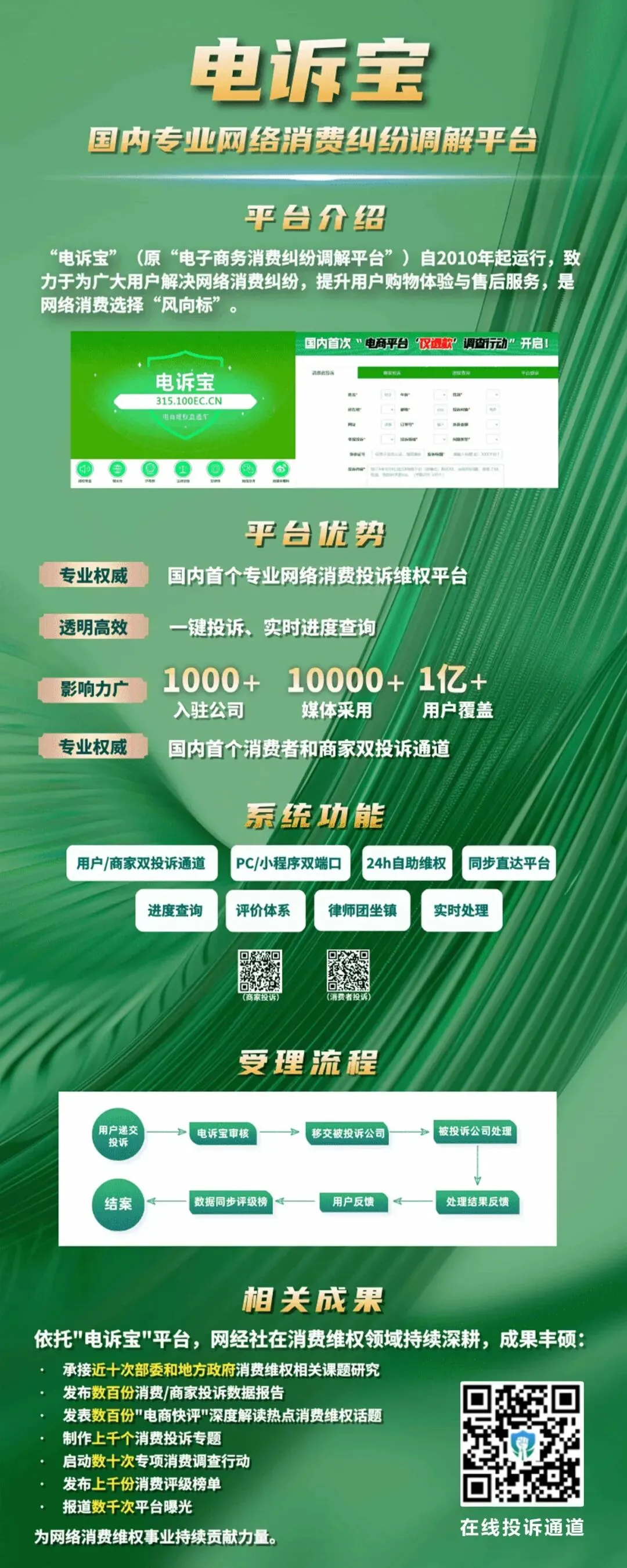 目前,平台“绿色通道”服务向广大网络消费平台开放,平台可自主申请入驻,实时受理、反馈和查询用户满意度评价。为了更好地营造公开、透明、健康的网络消费投诉环境,“电诉宝”公开版已正式上线,新增用户投诉实时受理动态、月度平台投诉量TOP10、热点投诉地区、投诉榜(依据投诉量排行)等模块,让投诉过程透明化,一手掌握信息动态。