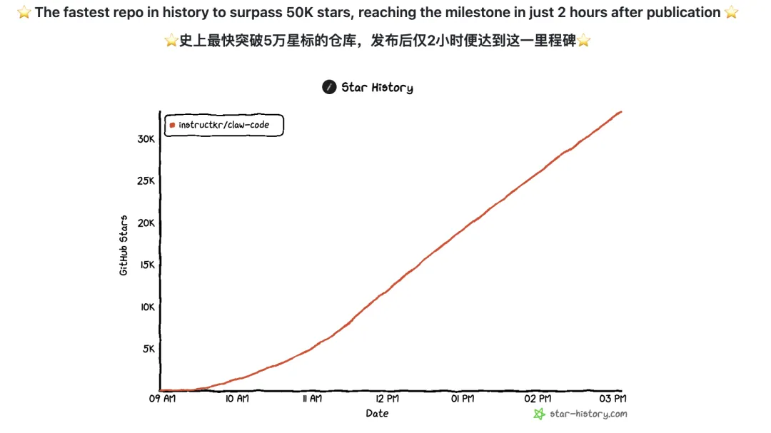 开发者@realsigridjin眼疾手快,第一时间将泄露的源码备份至GitHub仓库instructkr/claude-code,标注为”Claude Code Snapshot for Research”。该仓库上线仅两小时,Star数便突破五万,创下GitHub历史上最快达成这一里程碑的纪录。