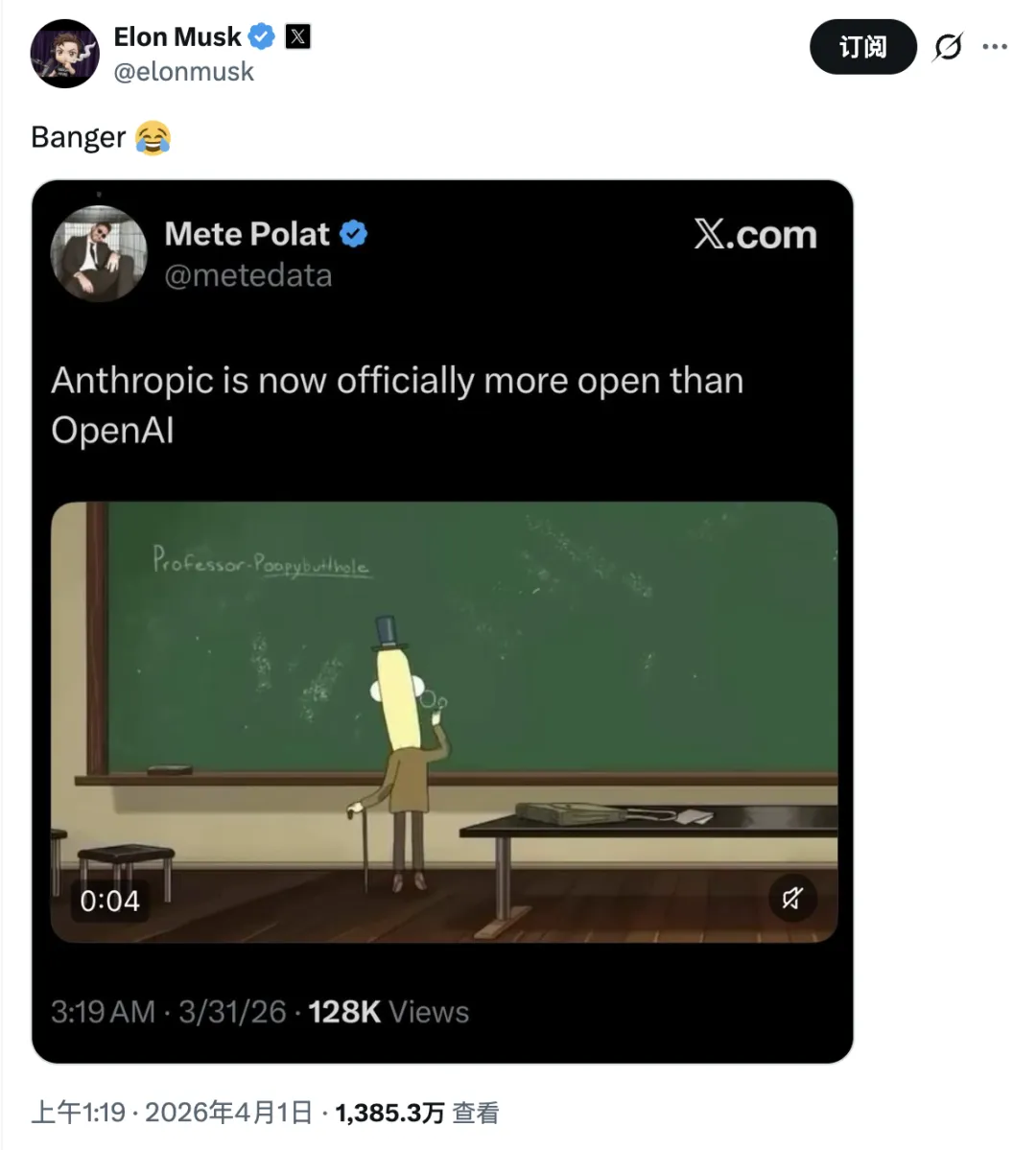 马斯克也没错过这场热闹,转发网友调侃Anthropic”现在比OpenAI更开放”的帖子,并留下一句”太绝了😂”。