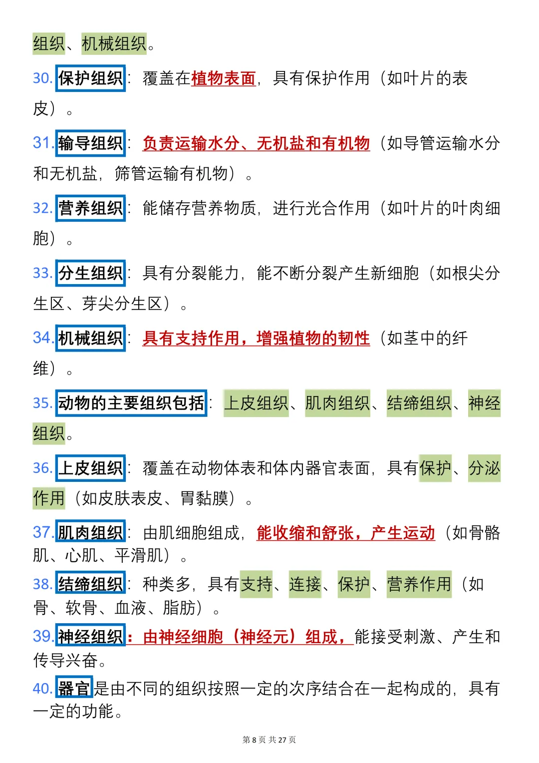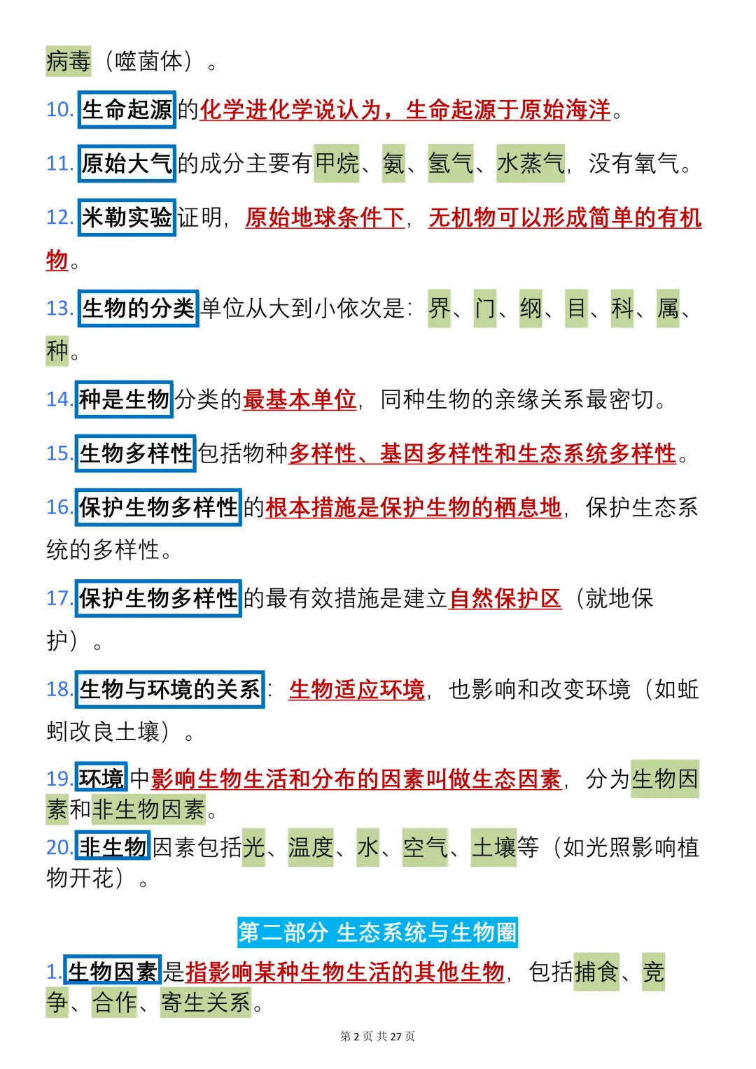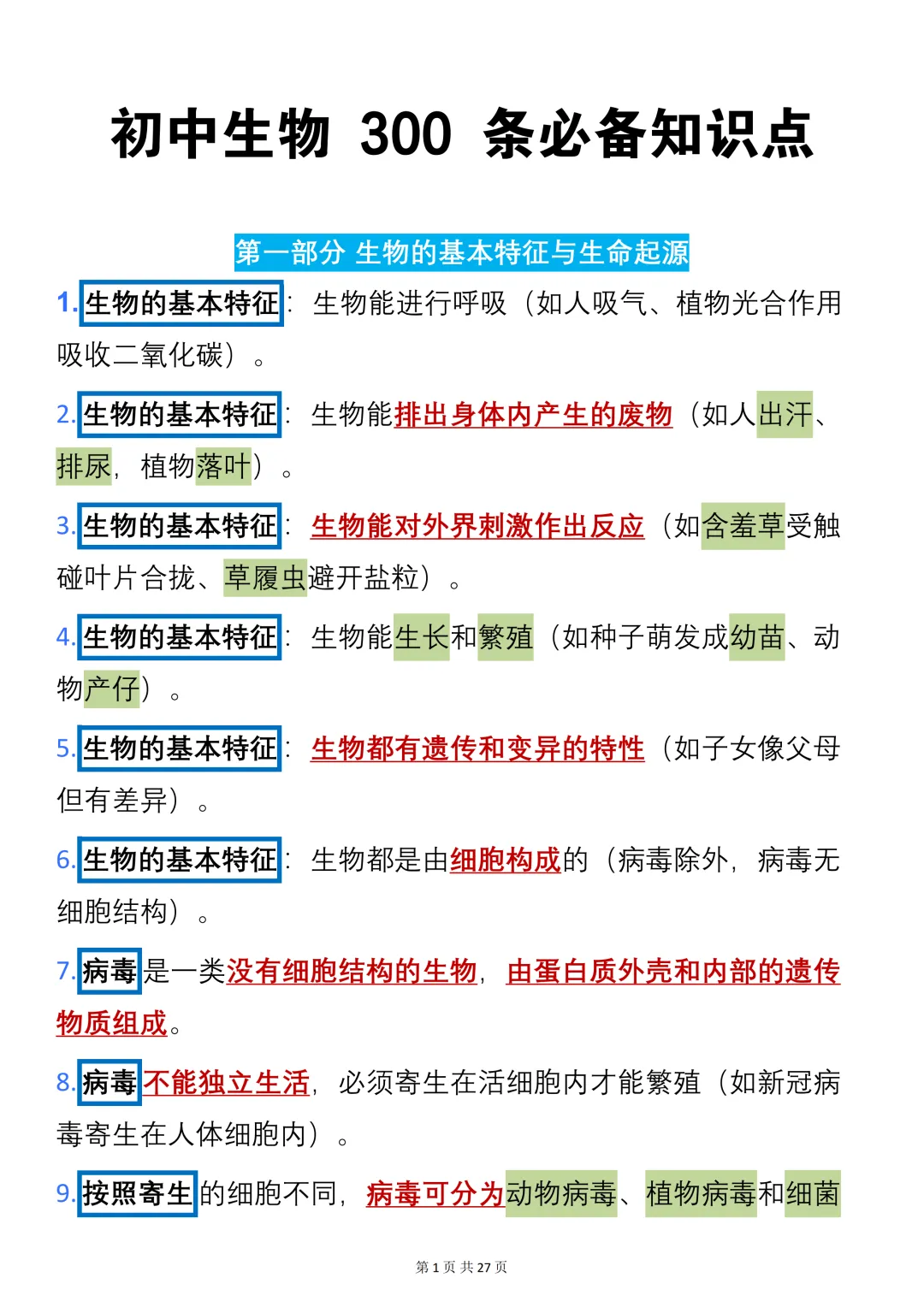 中考生物必背【300条核心基础知识】,可打印 快收藏 初中生物提分有妙招,核心关键在 “核心基础知识点”。核心基础知识点的积累是根基,尽管题型灵活多变,答题核心的本质始终不变。 今天给大家整理了中考必备的【中考生物最全基础知识总汇(全年级覆盖)】,不管题目如何变式,都能让表达更出彩,轻松拿下高分! 因篇幅有限,点击我的头像私信我回复 “资料获取” 就可以领取 word 电子版。以下是部分资料内容,完整高清版的发送私信即可。 受文章篇幅限制,仅能分享部分内容~ 领取方法: 1、先下方点👍“赞”➕♥“推荐,然后关注下方公众号 2、在对话框中回复“ 资料获取 ”即可获取完整电子版 更多资料及学习方法持续更新中……
