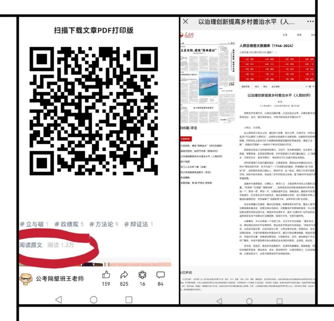【文章页面下拉到最后,在左下侧可以看到“阅读原文”选项,点击就可以直接进入人民日报官方链接(显示如右图)。我每天分析的文章是按照申论考试要求在人民日报文章基础上修改的,大家可以对照原文、关注区别,学习效果会更好。】