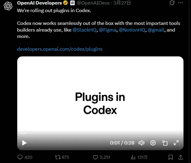 Codex这次更新主要有两件事: 一是模型升级(GPT-5.4 系列), 二是插件系统上线(Codex plugins)。