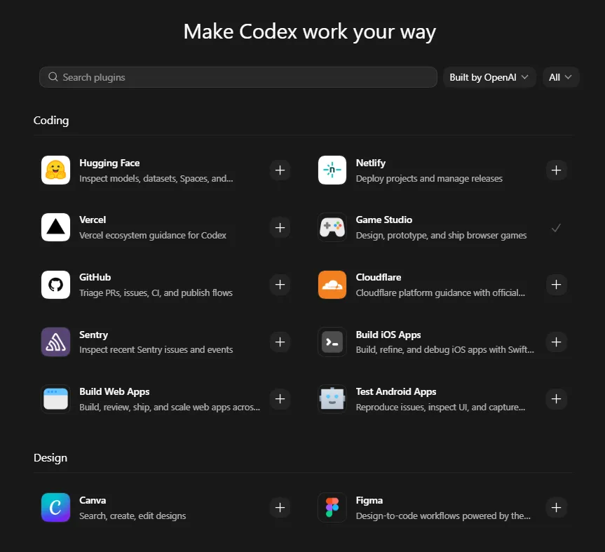 也就是说官方帮你把skills和MCP打包好了。而且某些Plugins官方还专门强化了相关的能力,比如Game Studio。