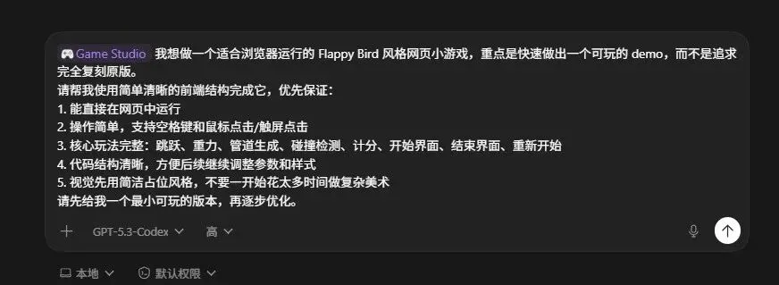 比如用 Game Studio 这个 plugin,我让它帮我做了一个网页版的 Flappy Bird。