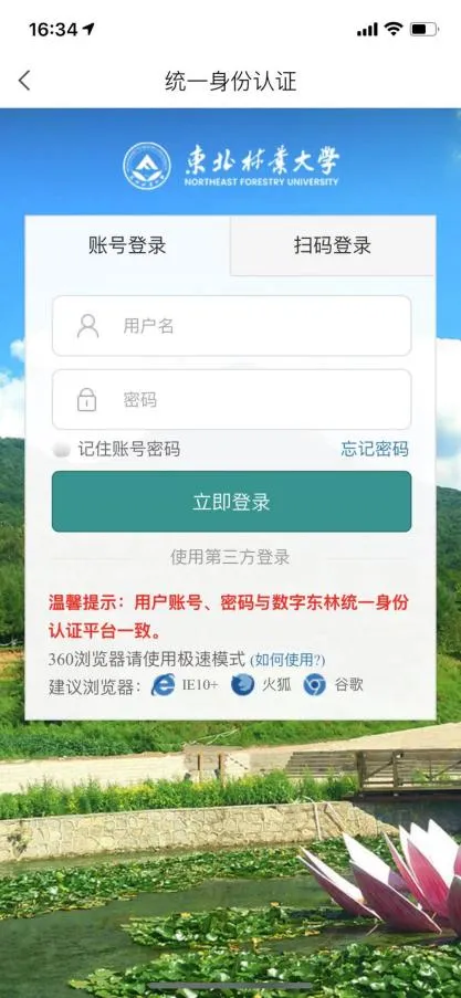 下载完成后,使用手机号快捷登录,手机号获取验证码,设置登录密码,输入UC码124329,在出现的下拉菜单中点击东北林业大学图书馆,点击后跳转统一身份认证界面,再输入统一认证的账号和密码即可登录。