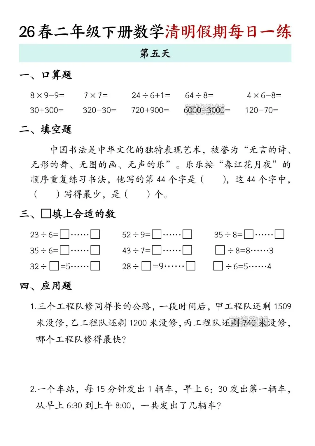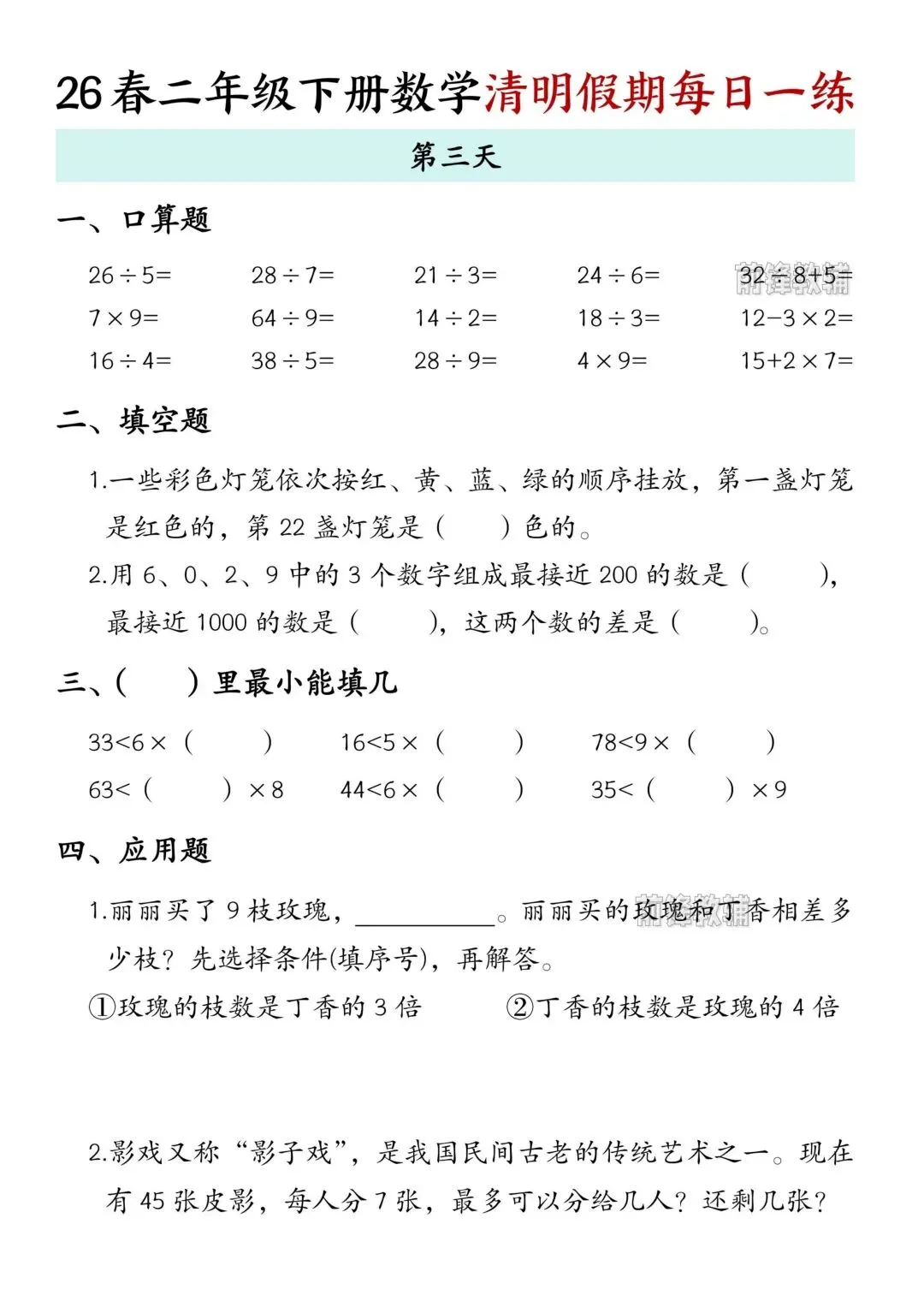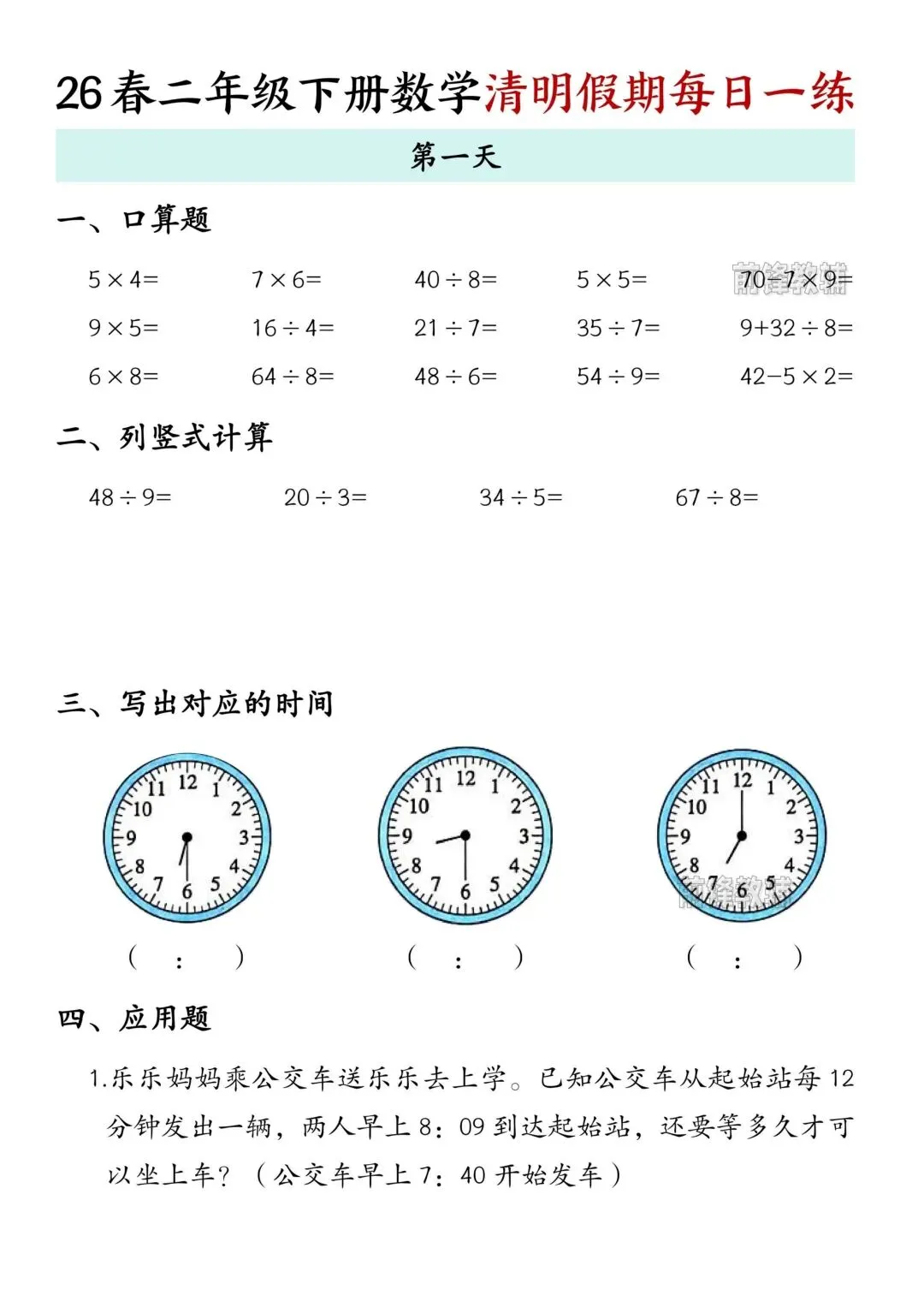 清明小长假,不少家长都在纠结:让孩子彻底放飞?怕开学跟不上;逼孩子刷题?又怕假期变“煎熬”。这份二年级下册数学清明假期每日一练,完美解决你的烦恼!每天1页、15分钟搞定,不占用游玩时间,还能把计算、应用、思维全练透,让孩子在轻松中夯实基础!