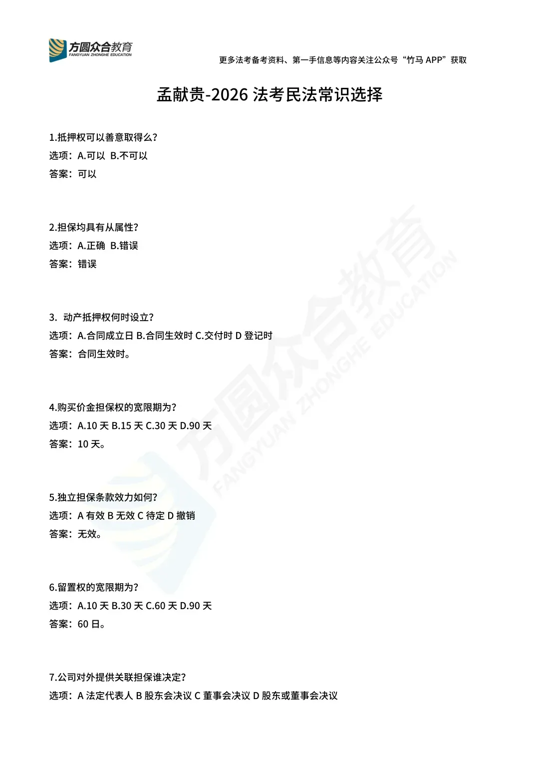 法考||孟献贵民法常识选择题丨PDF打印版