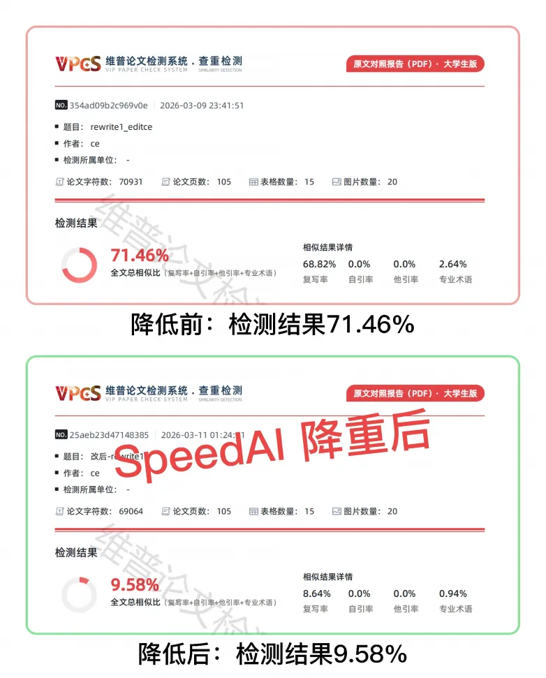 不同平台的AIGC检测逻辑差异明显,同一篇论文在知网和维普的AI率可能相差20%以上。SpeedAI由北航团队研发,已经同步破译了各大平台最新的检测算法,针对词汇搭配、句式结构、段落节奏等AI识别的核心维度做定向改写,从底层修改AI生成的“指纹特征”,不管你学校用哪个平台检测,都能达到合格标准。