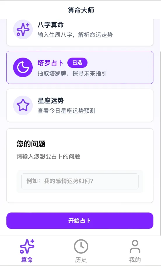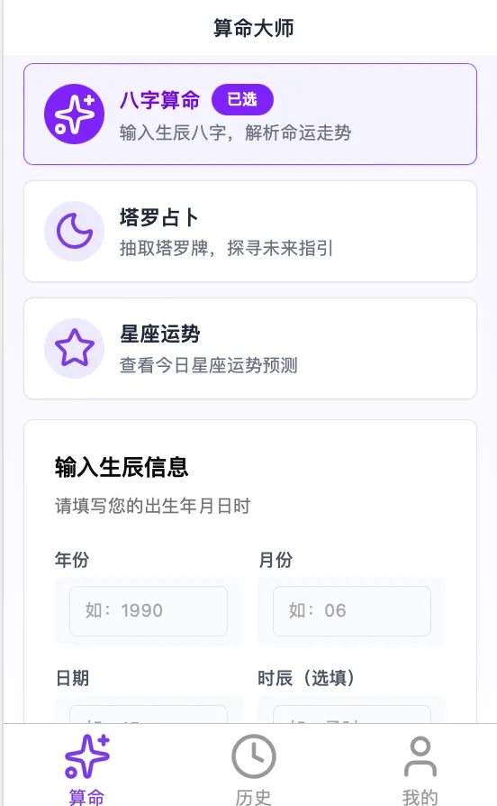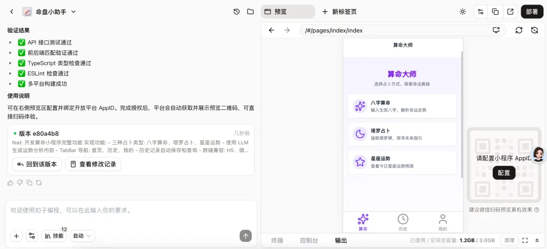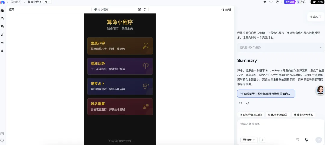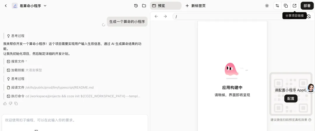 比如,分别用扣子和秒哒帮我生成一个算命的小程序。