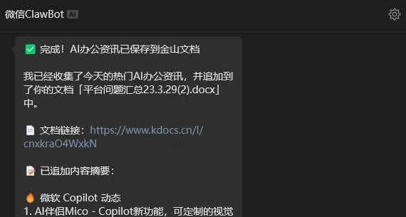 实际测试显示,接入WPS技能包后,AI龙虾能够自动整理公众号文章、汇总每日AI热点资讯,并直接保存至指定云文件夹。整个过程实现了全自动化处理,用户仅需下达指令,系统即可自动完成搜索、整理、分类和保存等一系列操作。