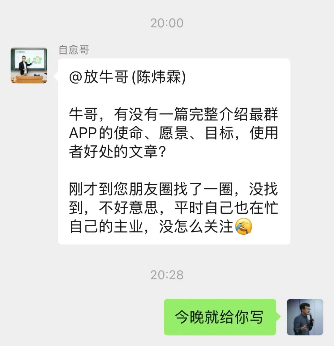在最群,我希望每个人都可以拥有10万+好友。不是粉丝,是好友——双向的、平等的、能聊上话的。有了这10万好友,你就是“超级个体”,你就是自己的王,你做什么生意都能做起来了。