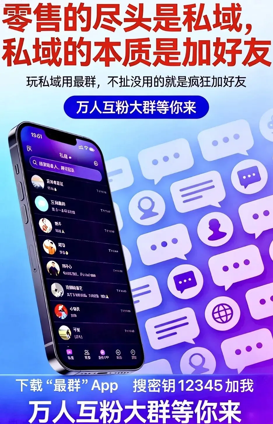 你可以通过万人互粉群快速加满好友,也可以通过行业群、兴趣群精准添加目标人群。好友10万+不是上限,希望是你的标配,且平台无权拿走。这些好友是你的私产,你可以随时群发、私聊、建群、营销变现。
