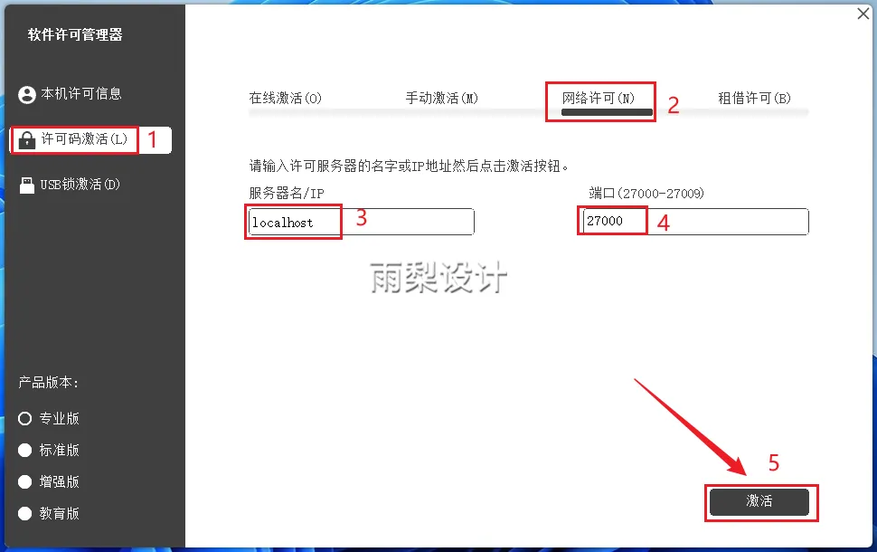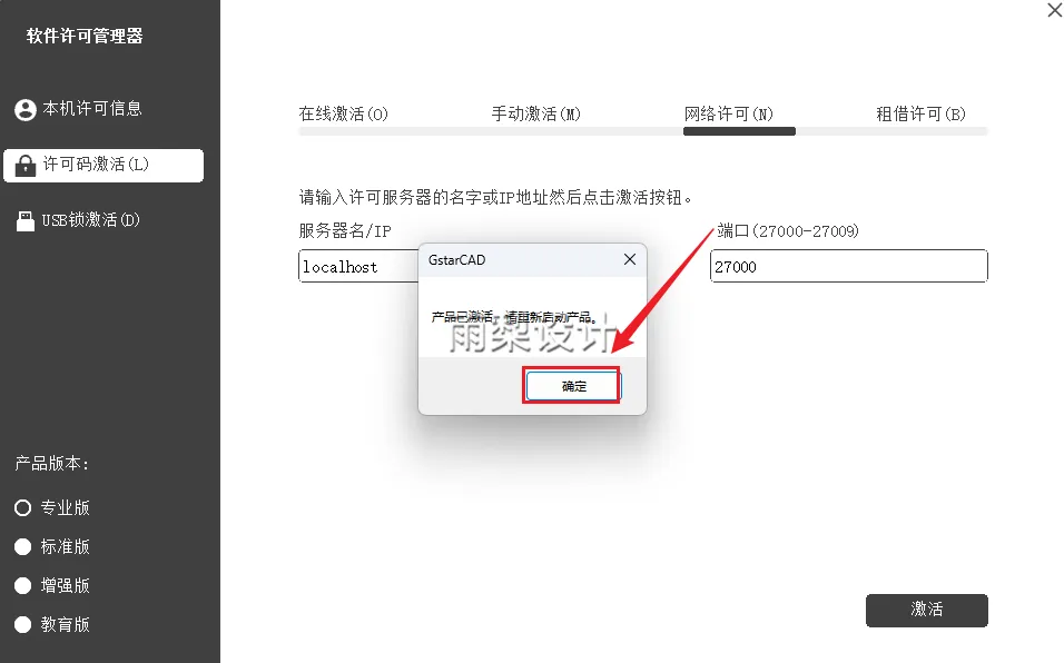 21.点击【许可码激活】,点击【网络许可】,服务器名输入【localhost】,端口输入【27000】,点击【激活】