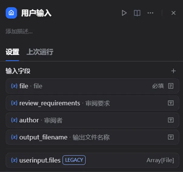 在开始节点中,除了上传文件,增加了几个可选输入项,并设置了默认值。