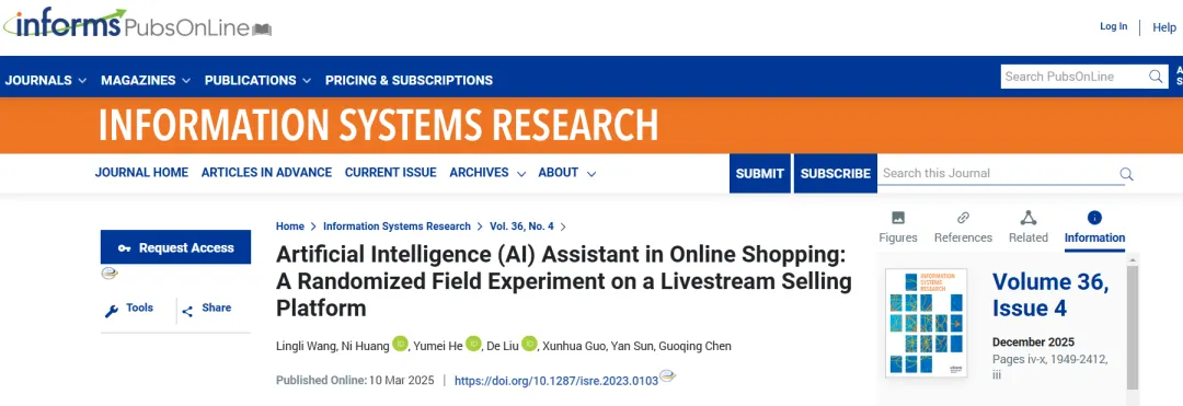 参考文献:Wang L , Huang N , He Y ,et al.Artificial Intelligence (AI) Assistant in Online Shopping: A Randomized Field Experiment on a Livestream Selling Platform[J].Information Systems Research (INFORMS), 2025, 36(4).DOI:10.1287/isre.2023.0103.