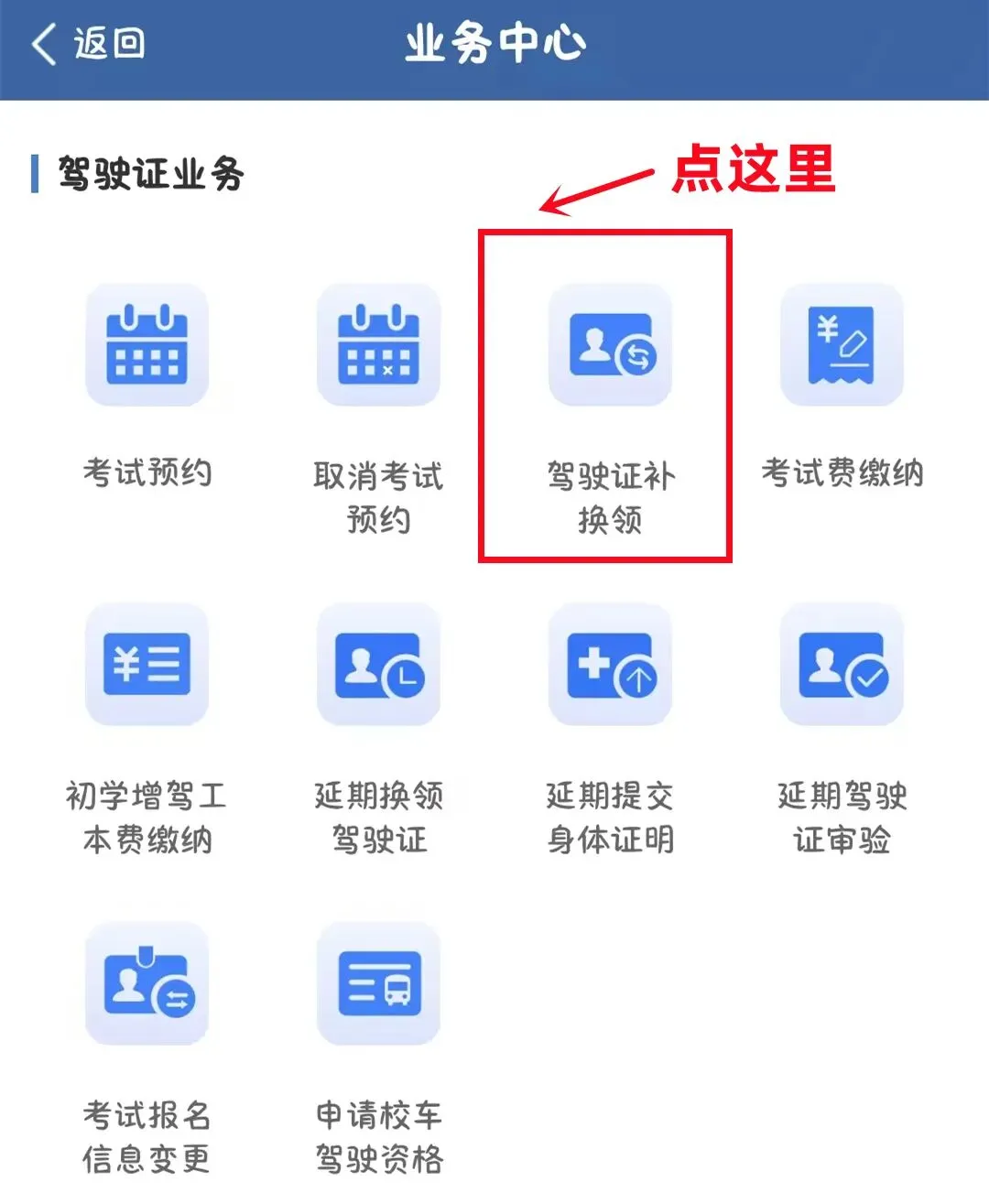 第一步:登录“交管12123”APP后,通过【业务中心】→【驾驶证补换领】,进入期满换领驾驶证业务流程。