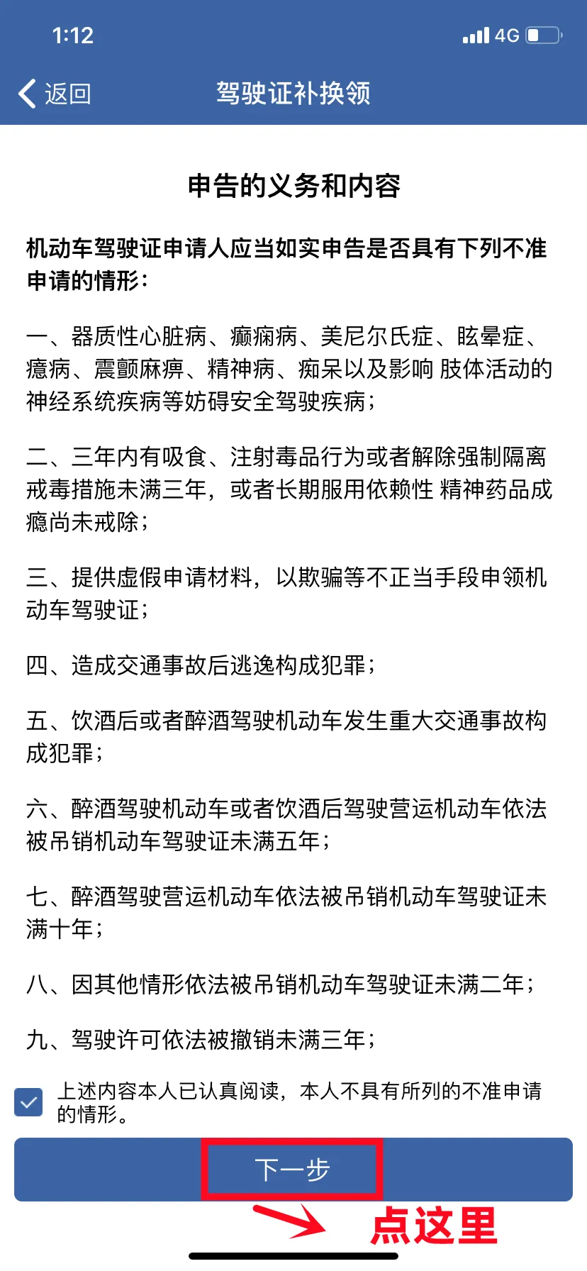 第二步:认真阅读驾驶证补换领申告的义务和内容,点击下一步。