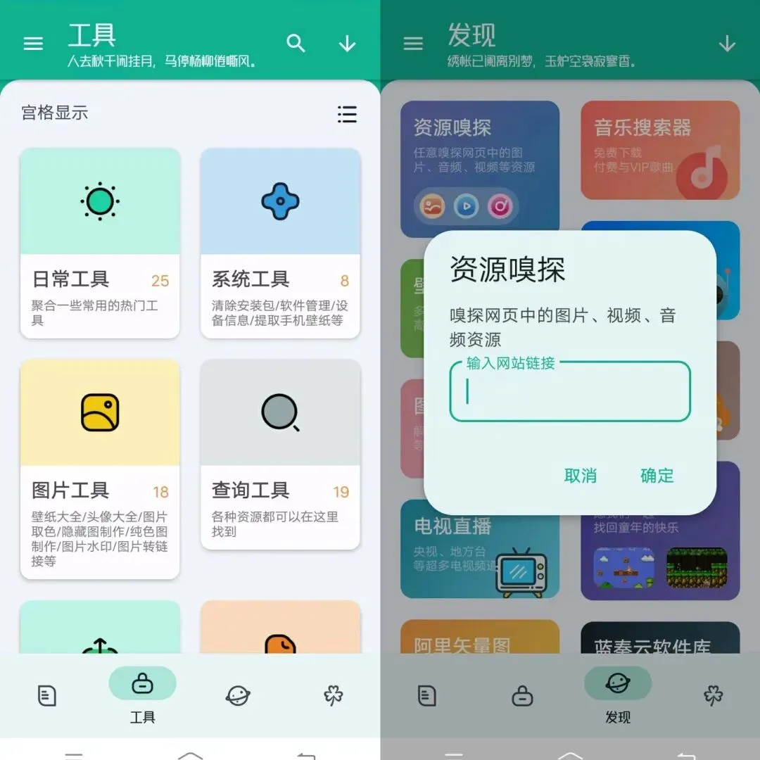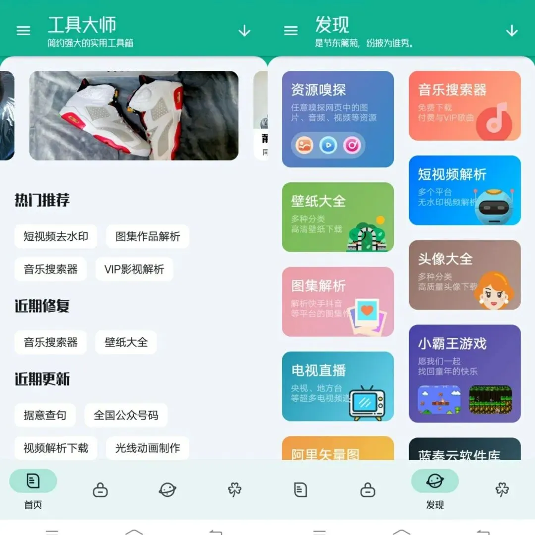 在发现页中,提供了一系列的实用功能,包括资源嗅探、音乐搜索器、短视频解析、壁纸大全、图集解析、头像大全、小霸王游戏、电视直播、阿里矢量图、蓝奏云软件库等。