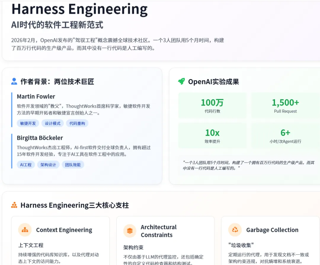 Martin Fowler 网站上 Birgitta Böckeler 撰写的《Harness Engineering》一文,不仅是对 OpenAI 技术实验的专业解读,更是对整个软件工程行业未来发展的深刻洞察。文章通过系统分析 Harness Engineering 的核心概念、技术内涵和实践案例,为我们描绘了一幅 AI 时代软件工程的新图景。