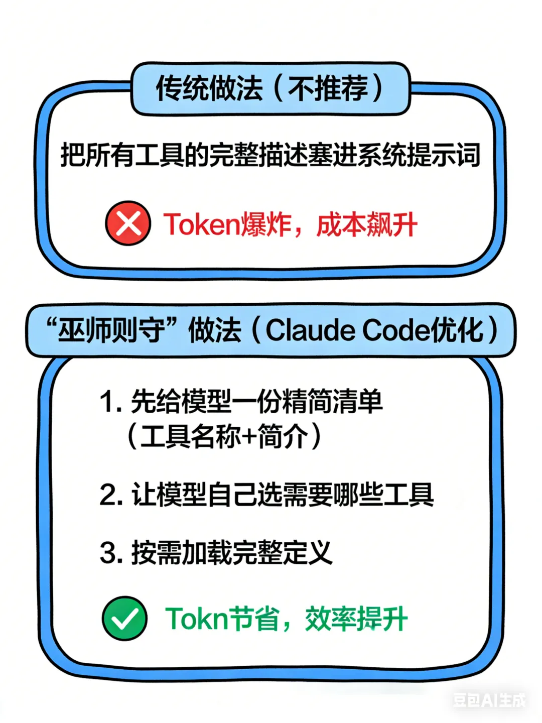 // 伪代码示意const toolCatalog = tools.map(t => ({name: t.name,brief: t.description.substring(0, 50) // 精简描述}));// 让模型先选const selectedTools = await model.selectTools(toolCatalog, userQuery);// 再加载完整定义const fullDefinitions = selectedTools.map(t => getFullDefinition(t.name));