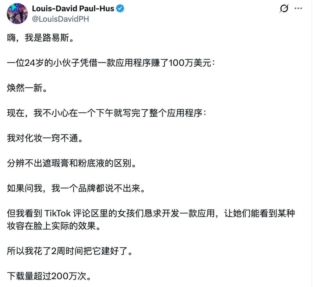海外开发者 Louis-David Paul-Hus 在24岁的时候做了一款APP,直接赚了100万美金。