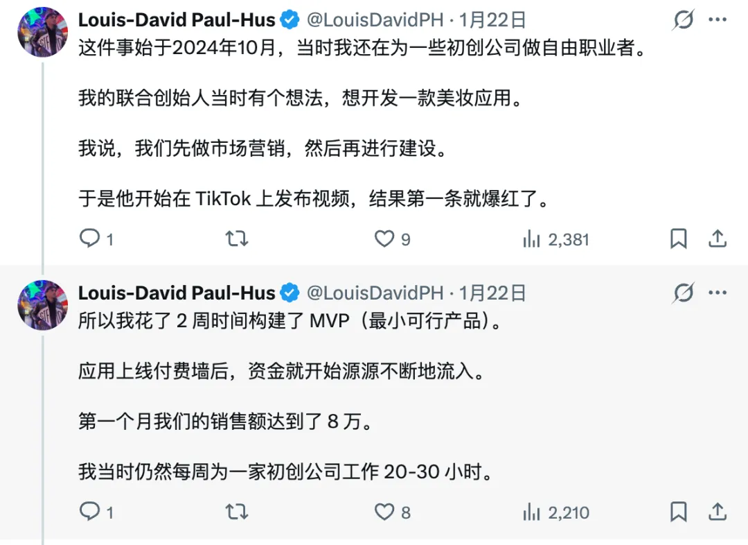 Louis 一开始先做的市场营销,在Tiktok上发了视频,结果第一条就爆了,然后花了2周时间做了MVP,第一个月销售额就达到了8万美金。