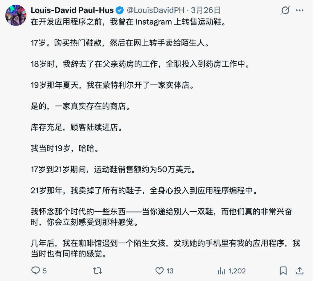 Louis 在17岁到21岁,一开始是在 ins 上卖运动鞋,后来开了家实体店,销售额大概50万美金。