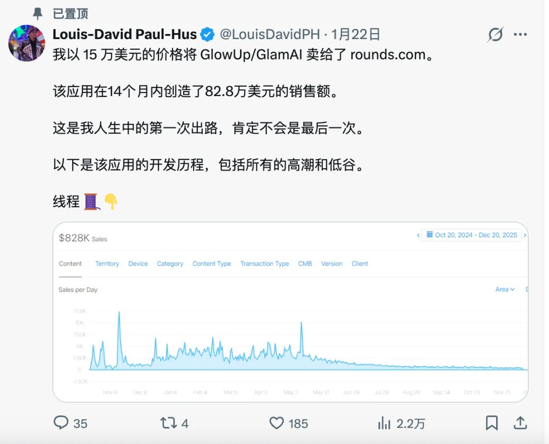 在今年1月份,Louis 以15万美金把 GlowUp 卖掉了。
