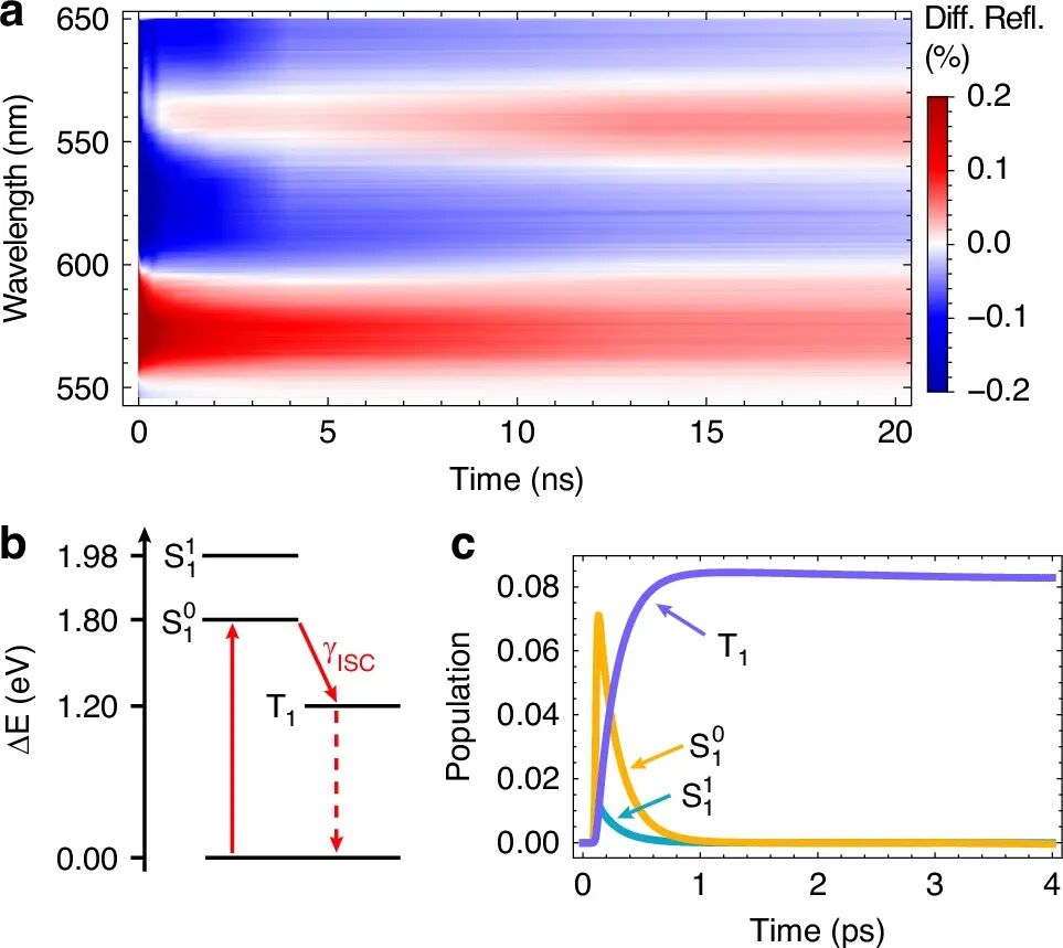 子图 B-C(系间窜越过程):CuPc 分子被光激发产生单重态激子后,会在~200fs 内通过系间窜越(ISC)快速转化为三重态激子 。由于泡利不相容原理,三重态激子无法直接跃迁回基态,因此具有 10~50ns 的超长寿命,成为量子电池的能量 “蓄水池”。