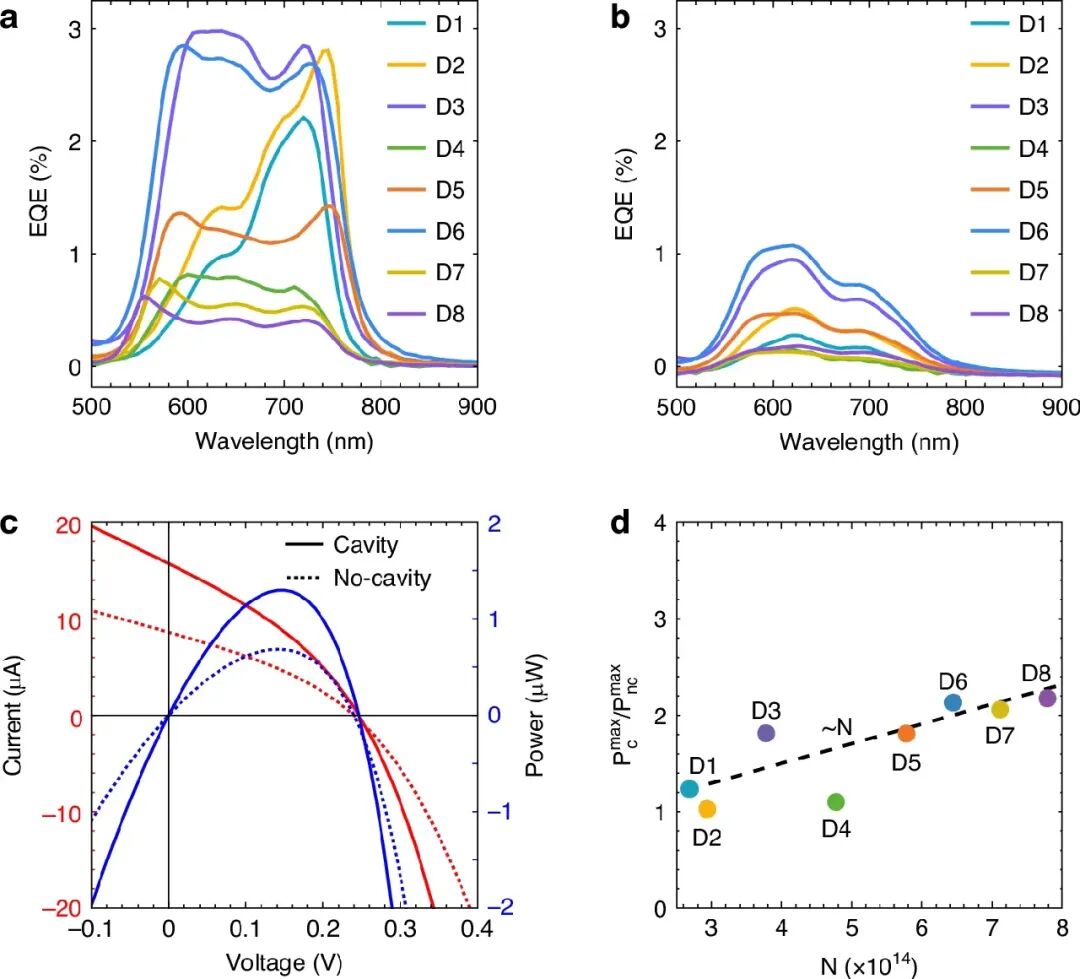研究团队制备了 8 个梯度器件(D1-D8),通过改变 CuPc 层厚度调控吸收分子数 N(2.8×10¹⁴~7.9×10¹⁴),并在同一衬底上同步制备无腔对照器件,彻底消除了工艺差异对实验结果的干扰。