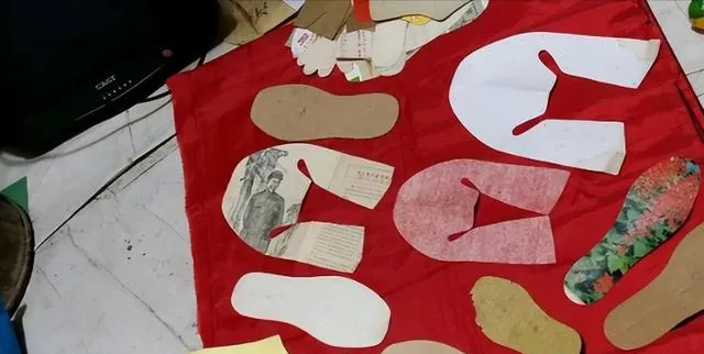 一张老红布上铺着各式各样的鞋模子,纸的、布的都有,过去想要新鞋,都是娘亲一张张剪模板,然后裁布,家里添口人,鞋帮事儿全靠她们的手艺撑着,4块钱买双鞋,自己做一双才用1块多,省钱又舒服,还有股娘做的香气。