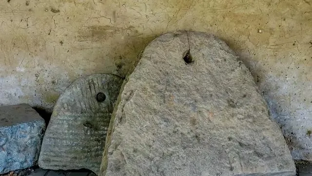 图里的这个大石头叫石碾子,两块圆盘摞一起,也有一个立着一个卧着的,木头轴穿过中间,拴着牛拉驴赶,人跟在后面喊一嗓子,它就在地上碾来碾去,小时候院墙角落边就有,说实话自己很少推得动,全靠牲口带着走,磨出来的面细腻又有筋道,奶奶说以前只有逢年过节才能磨上一回白面,全家都围着劲头十足。