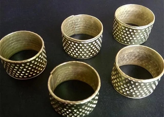 一圈圈的小铁圈就是顶针,缝鞋底、纳鞋垫、做衣时,指头套着这圈顶针,一推一按,能省不少劲,碰到厚布料别指望不用这玩意,力气小还真扎不穿,妈妈说小时候冬天纳千层底,顶针都能顶出茧来,后来用的少了,偶尔还能在针线筐里翻到它。