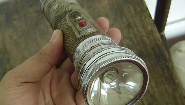 铁皮外壳开关突出,这种手电筒耐用结实,按下去红绿灯亮,小时候摸黑去鸡窝找蛋,父亲手里一晃,光柱直射草窝里,心里踏实一大半。
