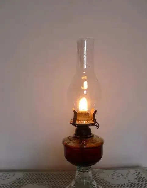 这盏灯叫煤油灯,玻璃罩高高立着,火苗一点亮,黄黄的光笼着屋子一角,老妈说她小时候做作业得挪着本子就着灯光,每次灯芯一烧短,还得用火柴烧一烧,把那头撸出来,要不光就暗下去了,呛鼻子的煤油味儿混着书本味,印在心头,晚上一圈人扎在灯下缝补、择菜,一夜就过去了,现在一开灯屋里亮堂得不认人,煤油灯再也用不上。