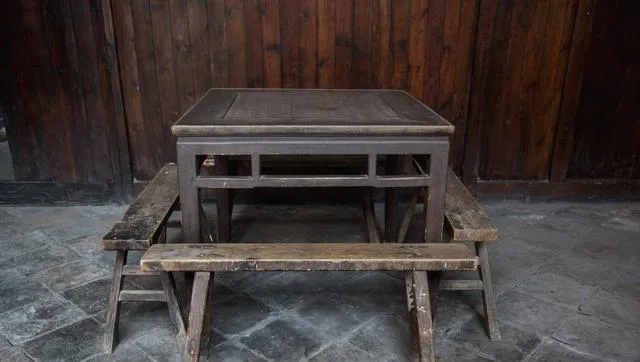 这套正方形桌子和四条长板凳合起来就是老家的八仙桌,四边坐满正好八人,逢年过节全家老小都得围着它吃饭、喝茶、打牌,桌面摸上去油亮亮的,全是年头的光,桌下掉个碎馍渣都能被鸡逮着捡,桌子不高,孩子坐上去脚能蹭地,院里热闹场面就靠它撑着,现在农村白事红事还能见到新八仙桌,城市里都是圆饭桌了。