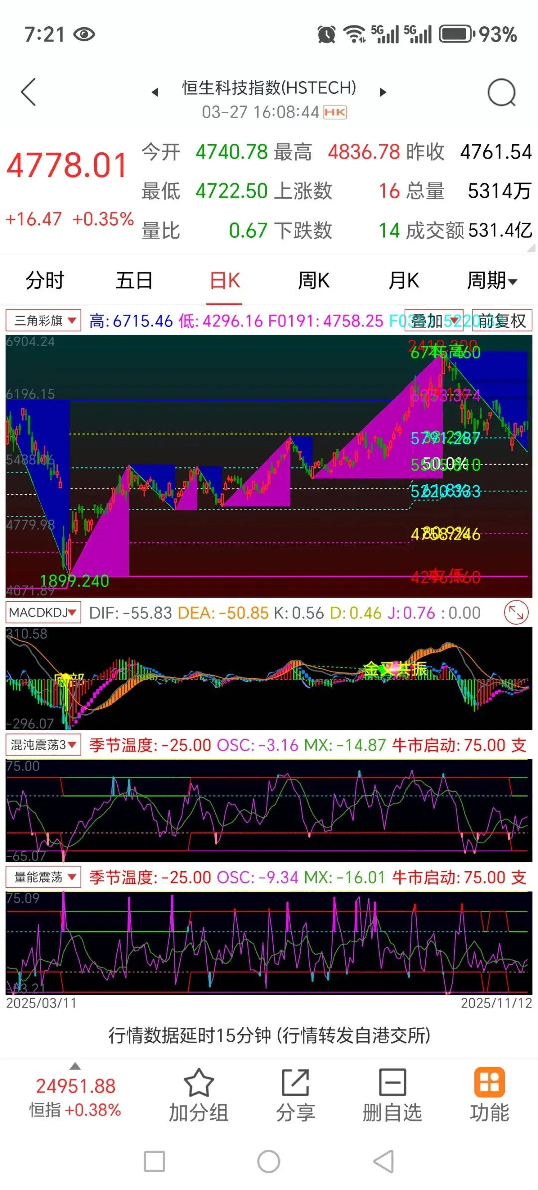仅供休闲娱乐 不构成投资依据通达信指标 效果图指标特点注意事项黄金分割波浪趋势资金指标特点(900字)本指标是融合波浪理论、黄金分割、时间周期、大资金流向的综合性高端分析工具,以波浪结构为骨架、黄金分割为测算依据、资金数据为验证核心,构建起集趋势判断、压力支撑测算、时间拐点定位、资金强弱监控于一体的完整交易分析体系,适合中长线波段与精准拐点交易,专业性与实战性突出。指标以动态黄金分割为核心测算工具,通过PEAK、TROUGH函数自动识别近期波段高低点,自动绘制0.191、0.382、0.500、0.618、0.809五条关键分割线,不同色彩区分各档位压力支撑,无需手动画线即可精准定位回调与反弹目标位,兼顾左侧预判与右侧确认,为买卖点位提供量化参考,有效解决投资者支撑压力判断模糊的问题。波浪趋势可视化是指标重要特色,通过DRAWLINE构建趋势上与趋势下两条动态趋势线,搭配DRAWBAND形成彩色三角背景区域,多头趋势呈现紫红色背景,空头趋势为深蓝色背景,趋势方向与强弱转换一目了然,直观呈现波浪运行结构,帮助投资者快速识别当前行情所处波浪阶段,顺势交易规避逆势风险。指标内嵌L2大资金流向监控系统,通过逐笔成交数据拆分超大单、大单、中单、小单,精准计算主力资金净流入流出,并用多层渐变K线直观展示:资金流入时K线呈现蓝青渐变多层色彩,资金流出时为橙红渐变,色彩层次与资金强度正相关,一眼识别主力吸筹与出货行为,解决传统K线无法反映资金本质的短板,实现价量资金三维验证。时间拐点与波浪测算功能极具特色,通过指定日期参数构建TL、TH、DC、TO时间节点,绘制波浪转折连线,并自动计算COP(0.618)、OP(1.000)、XOP(1.618)三大波浪目标价位,以黄色虚线持续延伸至当前周期,精准预判波浪理论中的目标涨幅空间,兼具时间与空间双重预判能力,适合把握波段主升行情。指标具备完善的区间涨跌标注系统,自动统计波段高低点价差、涨跌幅,在高低点形成时刻自动标注数值与文字提示,并根据涨跌方向智能切换黄金分割比例标注逻辑,上涨行情与下跌行情分别对应不同比例说明,同时自动显示各分割位具体价格数值,降低人工复盘难度,提升分析效率。整体界面采用沉浸式配色设计,涨跌K线自动切换背景色调,视觉层次分明,信息承载量大却不杂乱,既满足专业投资者对波浪、黄金分割、资金面的深度分析需求,也为普通投资者提供清晰直观的交易信号,是适配震荡与趋势行情、兼顾空间测算与资金逻辑的全能型技术指标。指标源码更多更好指标搜索本公众号DRAWGBK(O>C,RGB(0,50,50),RGB(66,0,0),0,’01’,0);N:=13;DO:=150612;DA:=150826;DB:=151117;DC:=160108;{黄金分割}高:IF (HIGH>PEAK(1,N,1),HHV(HIGH,N),PEAK(1,N,1))LINETHICK2,COLORBLUE;低:IF (LOW<TROUGH(2,N,1),LLV(LOW,N),TROUGH(2,N,1))LINETHICK2,COLORMAGENTA;F0191:(高-低)*0.191+低,DOTLINE,COLORMAGENTA;F0382:(高-低)*0.382+低,DOTLINE,COLORCYAN;F0500:(高-低)*0.500+低,DOTLINE,COLORWHITE;F0618:(高-低)*0.618+低,DOTLINE,COLORCYAN;F0809:(高-低)*0.809+低,DOTLINE,COLORYELLOW;{三角背景}趋势下:DRAWLINE(H=HHV(H,N),H,L=LLV(L,N),L,0)LINETHICK2,COLORGREEN;SX:=REF(趋势下,1)<趋势下;SS:=DRAWLINE(SX,趋势下,REF(SX,1),REF(趋势下,1),1);DRAWBAND(SS,RGB(0,0,160),趋势下,RGB(0,0,0));趋势上:DRAWLINE(L=LLV(L,N),L,H=HHV(H,N),H,0)LINETHICK2,COLORMAGENTA;JX:=REF(趋势上,1)>趋势上;JJ:=DRAWLINE(JX,趋势上,REF(JX,1),REF(趋势上,1),1);DRAWBAND(JJ,RGB(0,0,0),趋势上,RGB(180,0,180));DRAWKLINE(HIGH,OPEN,LOW,CLOSE);{大资金流向}超B:=L2_AMO(0,2)/10000.0;大B:=L2_AMO(1,2)/10000.0;中B:=L2_AMO(2,2)/10000.0;小B:=L2_AMO(3,2)/10000.0;超S:=L2_AMO(0,3)/10000.0;大S:=L2_AMO(1,3)/10000.0;中S:=L2_AMO(2,3)/10000.0;小S:=L2_AMO(3,3)/10000.0;大资金流向:(超B+大B)-(超S+大S)COLORYELLOW,NODRAW;DRAWKLINE(HIGH,OPEN,LOW,CLOSE);STICKLINE(大资金流向<0,O,C,2,0),COLORFF3300;STICKLINE(大资金流向<0,O,C,1.2,0),COLORFF6600;STICKLINE(大资金流向<0,O,C,0.5,0),COLORFF9900;STICKLINE(大资金流向>0,O,C,2,0),COLOR0066FF;STICKLINE(大资金流向>0,O,C,1.2,0),COLOR099FFF;STICKLINE(大资金流向>0,O,C,0.5,0),COLOR00FFFF;TL:=1000000+DA;TH:=1000000+DB;TC:=1000000+DC;TO:=1000000+DO;AL:=IF(REFDATE(CLOSE,TL)>REFDATE(CLOSE,TH),REFDATE(HIGH,TL),REFDATE(LOW,TL));BH:=IF(REFDATE(CLOSE,TL)>REFDATE(CLOSE,TH),REFDATE(LOW,TH),REFDATE(HIGH,TH));CZF:=IF(REFDATE(CLOSE,TL)>REFDATE(CLOSE,TH),REFDATE(HIGH,TC),REFDATE(LOW,TC));DJB:=IF(REFDATE(CLOSE,TL)>REFDATE(CLOSE,TH),REFDATE(LOW,TO),REFDATE(HIGH,TO));OP:=BH-AL+CZF;COP:=0.618*(BH-AL)+CZF;XOP:=IF((1.618*(BH-AL)+CZF)<0,OP,1.618*(BH-AL)+CZF);TODAY:=DATE;STICKLINE(DATE=TC,CZF,XOP,0,-1),COLORYELLOW;DRAWLINE(DATE=TC,COP,DATE=TODAY,COP,1),DOTLINE,COLORYELLOW;DRAWLINE(DATE=TC,OP,DATE=TODAY,OP,1),DOTLINE,COLORYELLOW;DRAWLINE(DATE=TC,XOP,DATE=TODAY,XOP,1),DOTLINE,COLORYELLOW;DRAWTEXT(DATE=TC,COP*1.003,'(COP=0.618)’),COLORYELLOW;DRAWTEXT(DATE=TC,OP*1.003,'(OP=1.000)’),COLORYELLOW;DRAWTEXT(DATE=TC,XOP*1.003,'(XOP=1.618)’),COLORYELLOW;DRAWNUMBER(DATE=TC,COP,COP),COLORYELLOW;DRAWNUMBER(DATE=TC,OP,OP),COLORYELLOW;DRAWNUMBER(DATE=TC,XOP,XOP),COLORYELLOW;DRAWLINE(DATE=TO,DJB,DATE=TL,AL,0)CIRCLEDOT,COLORGREEN;DRAWLINE(DATE=TL,AL,DATE=TH,BH,0)LINETHICK2,COLORYELLOW;DRAWLINE(DATE=TH,BH,DATE=TC,CZF,0)LINETHICK2,COLORCYAN;{区间涨跌}向上:=TROUGHBARS(2,N,1);向下:=PEAKBARS(1,N,1);涨%:=IF(向上<向下,(C/低-1)*100,REF((C/低-1)*100,向下));跌%:=IF(向下<向上,(C/高-1)*100,REF((C/高-1)*100,向上));DRAWNUMBER(向上=0,低*0.99,Abs(高-低)),COLORGREEN;DRAWNUMBER(向下=0,高*1.02,ABS(高-低)),COLORRED;ZHSJ:=IF(向下<向上,BACKSET(ISLASTBAR,向下),IF(向上<向下,BACKSET(ISLASTBAR,向上),0));DRAWTEXT(向下<向上 AND CRO