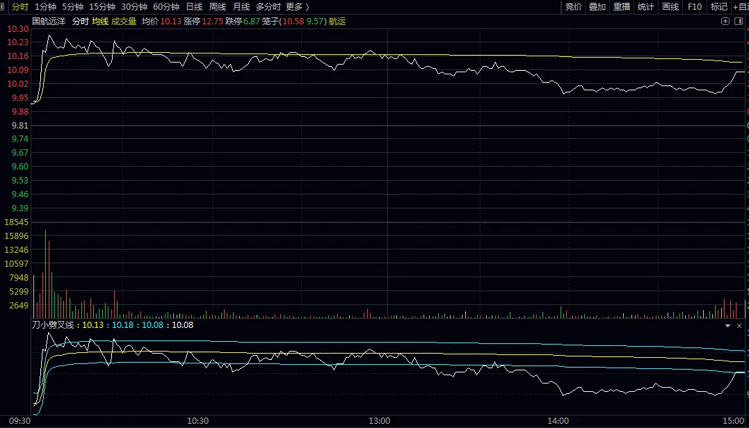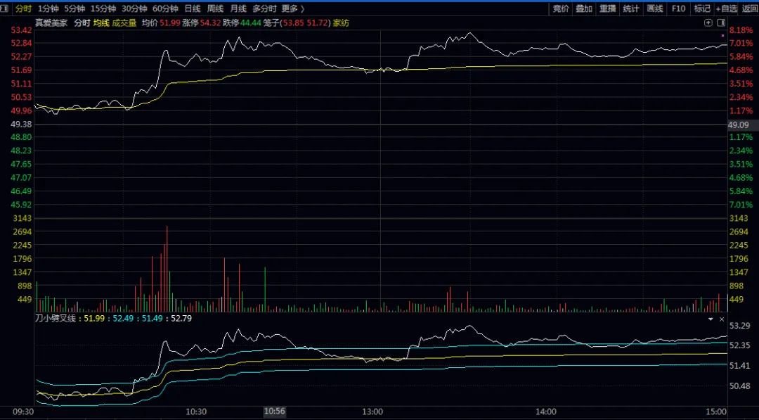 在分时图界面,输入你刚才保存的指标名称 “刀小劈叉线(分时)” ,按回车键即可加载。 -