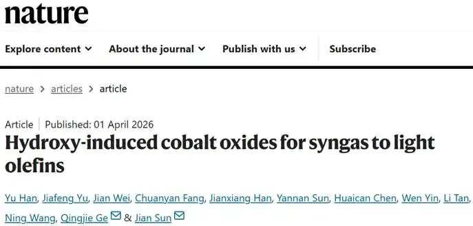 第一作者: Yu Han (韩誉)通讯作者: Qingjie Ge(葛庆杰),Jian Sun(孙剑)通讯单位:中国科学院大连化学物理研究所论文DOI: 10.1038/s41586-026-10204-4