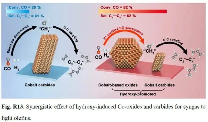 大连化学物理研究所葛庆杰/孙剑等的研究提出了一条全新的思路:引入羟基促进剂,诱导生成三斜晶系钴锰氧化物(anorthic Co-Mn oxides)作为CO活化的主要活性相,并与Co₂C协同,使CO活化从直接解离路径转向吸附氢辅助路径。该路径生成含氧中间体(如CHₓO),有利于后续C–C偶联生成烯烃而非过度加氢。这一“亲水促进”策略与疏水策略形成鲜明互补,为温和条件下合成气制烯烃开辟了新方向。