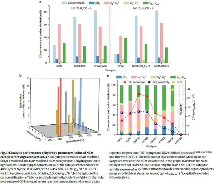 解析:图1a对比了未修饰NCM与三种羟基促进剂(AB、SiO₂(F)、HAP)物理混合后的催化性能。反应条件:250 °C、0.1 MPa、H₂/CO=2、GHSV=2000 ml·g⁻¹·h⁻¹。未修饰NCM的CO转化率仅28%,低碳烯烃(C₂⁻–C₄⁻)选择性约61%。引入AB后,CO转化率飙升至72%,烯烃选择性保持在61%;引入HAP后,转化率进一步提高至82%,烯烃选择性57%;SiO₂(F)效果介于两者之间。三种促进剂本身(如HAP100)几乎无活性,说明它们与NCM之间存在强烈的协同效应。值得注意的是,CO₂选择性在所有样品中约为45%,这是FTO路线的典型特征(水煤气变换反应副产CO₂)。然而,在H₂/CO=1的低氢碳比下,该体系仍能高效运行(见下文),意味着碳原子利用效率更高。